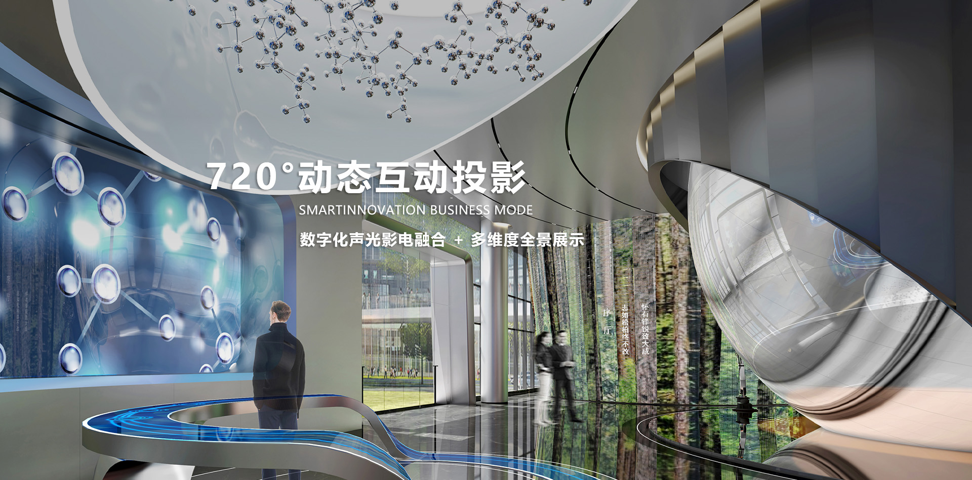 數(shù)字信息時(shí)代,華竣數(shù)創(chuàng)運(yùn)用燈光秀、超清視頻、特種影院等新媒體視覺藝術(shù)的聲光影電炫酷效果調(diào)動(dòng)觀者的所有感官全身心參與展廳視聽體驗(yàn),享受沉浸式心流狀態(tài)。